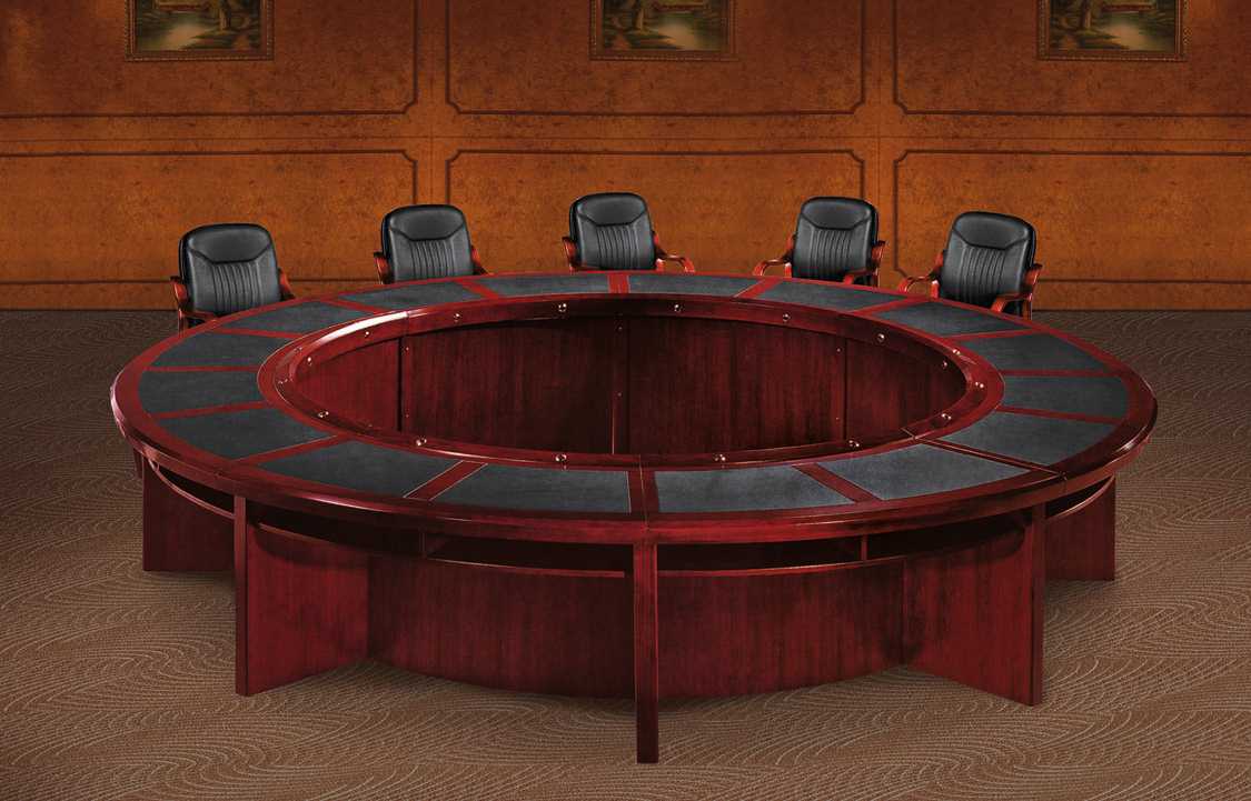 This round boardroom table is made of mahogany veneer finish and it has a 70mm thick top. The double layer top gives you extra space for your books and stationery. It has scratch resistant leather inlays, an open center as well as aluminium cable wholes and seats 12.
