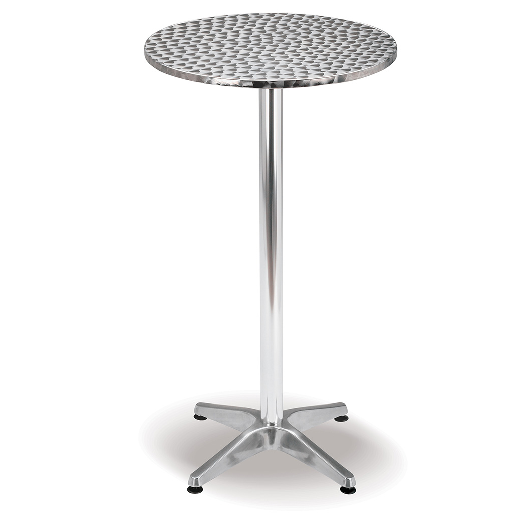 Size: 600 dia x 1100 heigh Aluminium pole with cast aluminium base Stainless steel is molded over super wood top No edging around table Not to be left in the rain