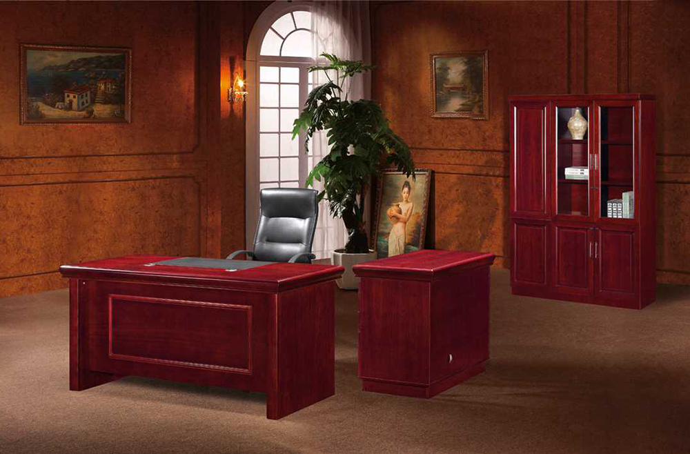 This office desk is idealy for general usage. It’s made of a mahogany veneer finish and has a scratch resistant leather inlay on the desk top. It has a free standing credenza that can be used on either sides. The credenza consists of 1 hinge door, 2 standard drawers and one deep filer.