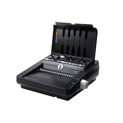 Binding doesn’t get any simpler. The GBC CombBind C450E is ideal for high volume, shared use. Electronic paper punching and colour coded Pro Combs make binding quicker and easier. It combines a punch capacity of up to 25 x 80gsm sheets with a binding capability of up to 450 sheets using 51mm spines, binds A3 portrait, A4 or A5 sizes and is equipped with features such as auto centering and a paper separator.