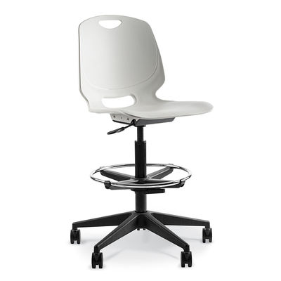 Polyprop shell on Black nylon five star castor base with swivel, gas height adjustment and adjustable footring. Ideal for cashier, teller or draughting applications.