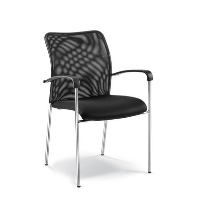 Stackable armchair Chrome frame with mesh back and upholstered seat.